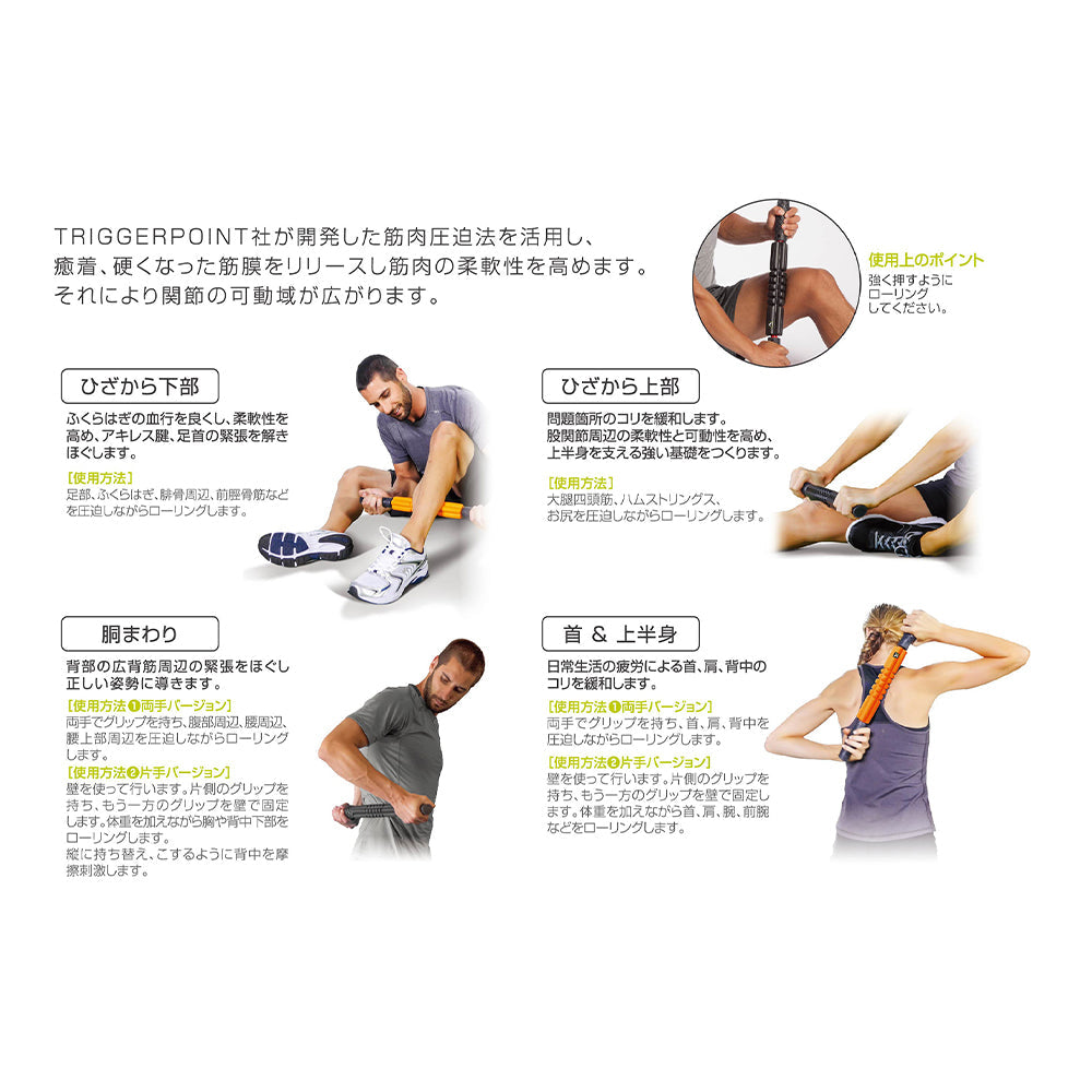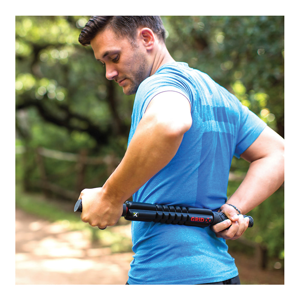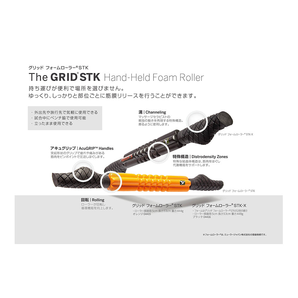 The GRID® Foam Roller STK-X(グリッドフォームローラー STK-X)は、硬めの素材でしっかりと部位ごとに筋膜リリースを行うことができます。立ったままで使用できる硬質スティックタイプ。寝転んだ姿勢が困難な方でも立ったまま・座ったままセルフケアが可能。